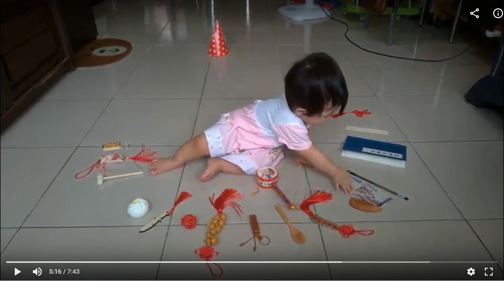 所以老P太太用最便宜的方式,網路上買抓周的道具,把亮亮打扮的漂漂亮亮,自己在家裡舉行抓周的儀式。