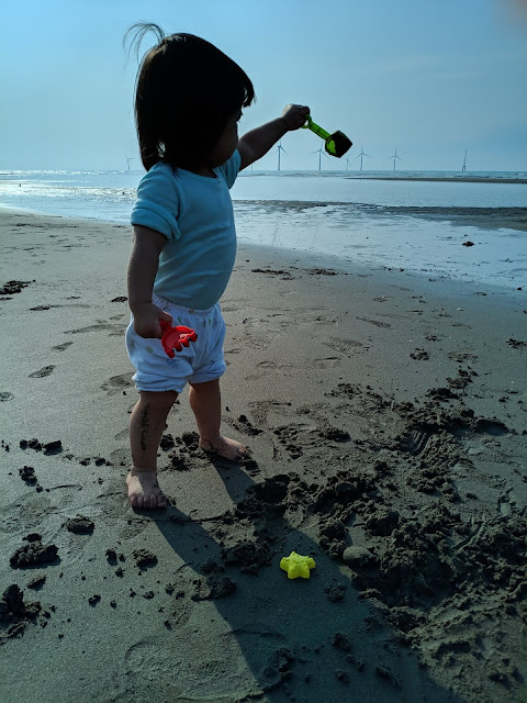 1Y7M 女兒第二次挑戰海灘(假日之森),終於不吃沙子了。